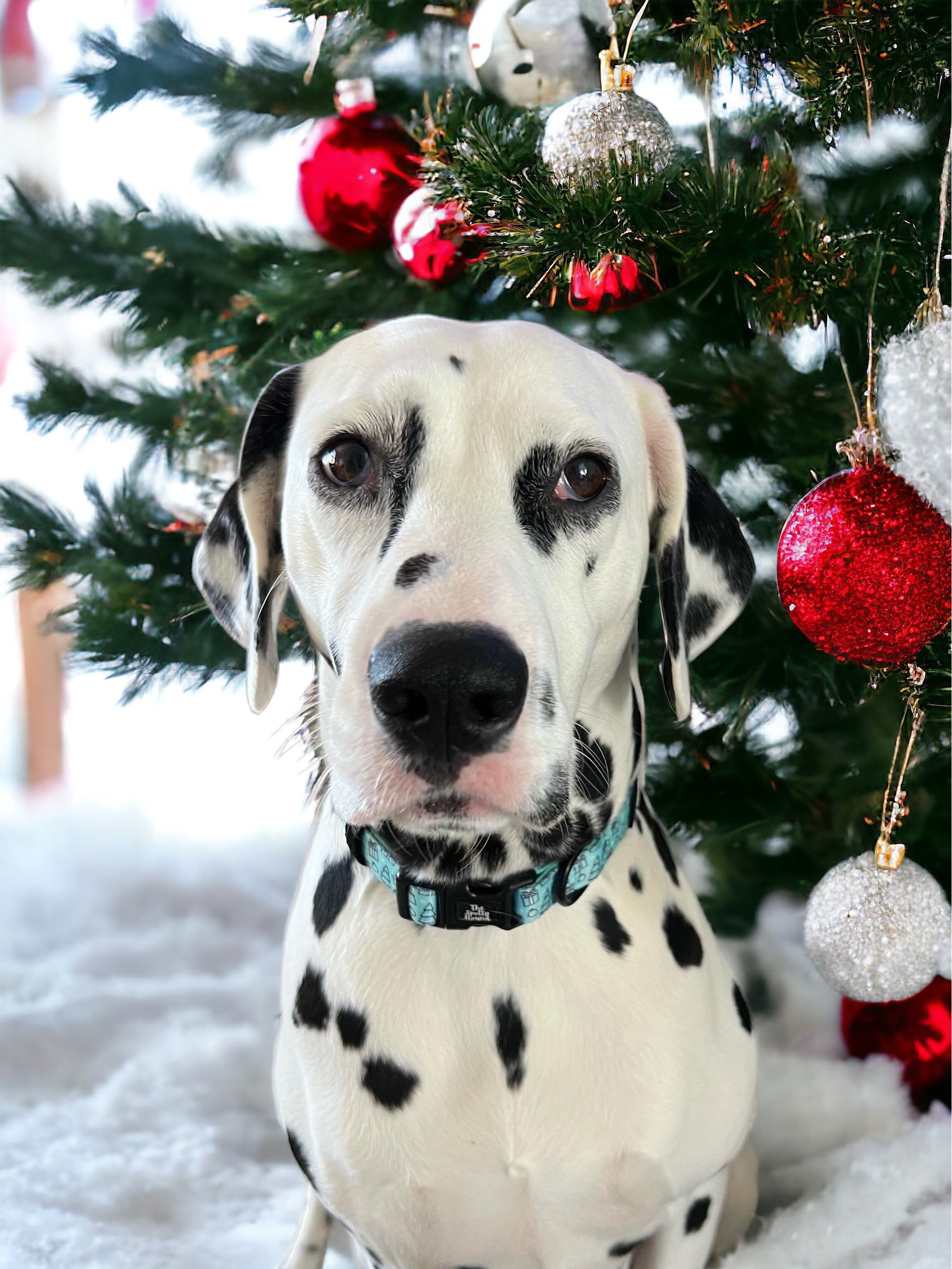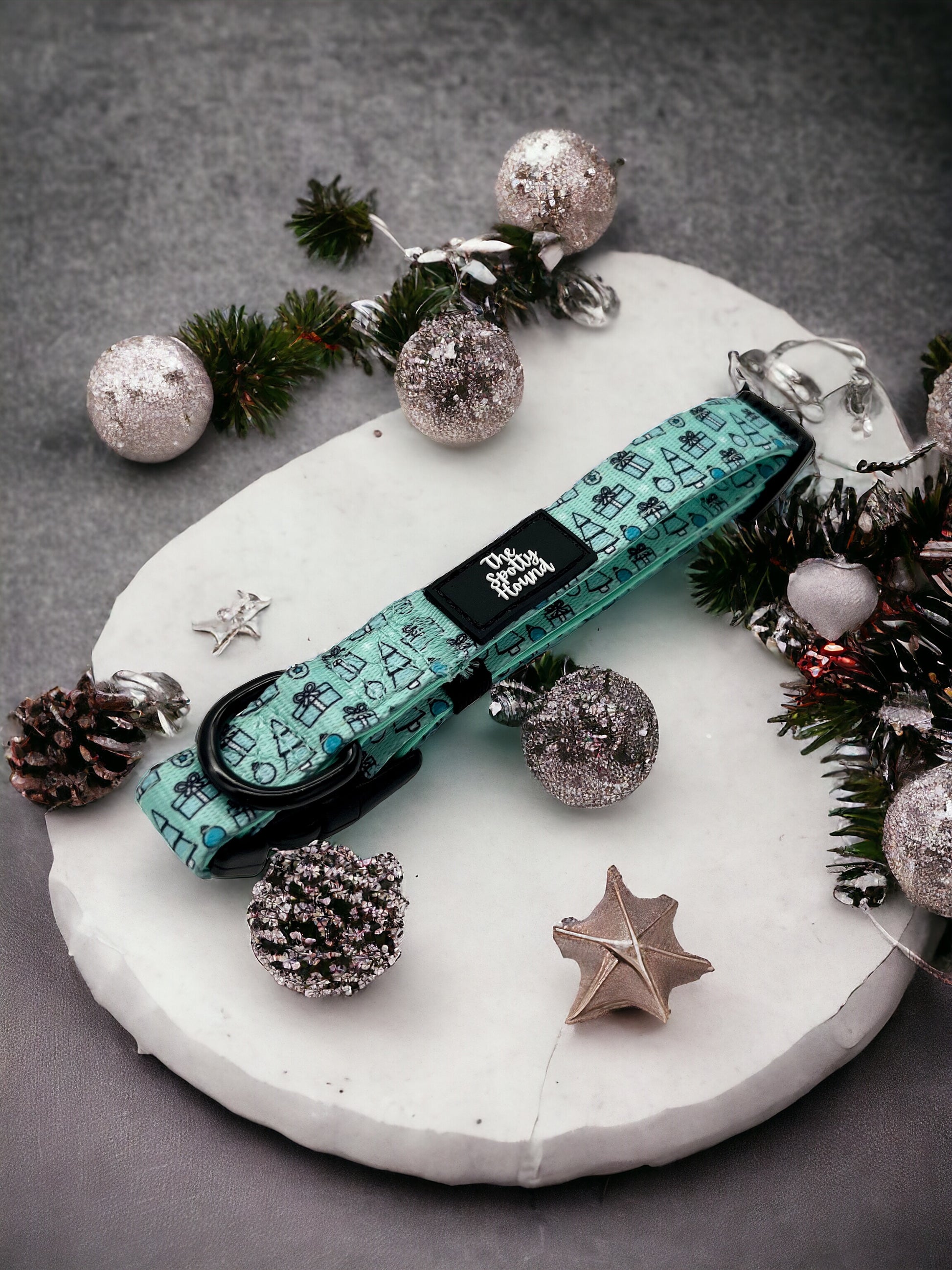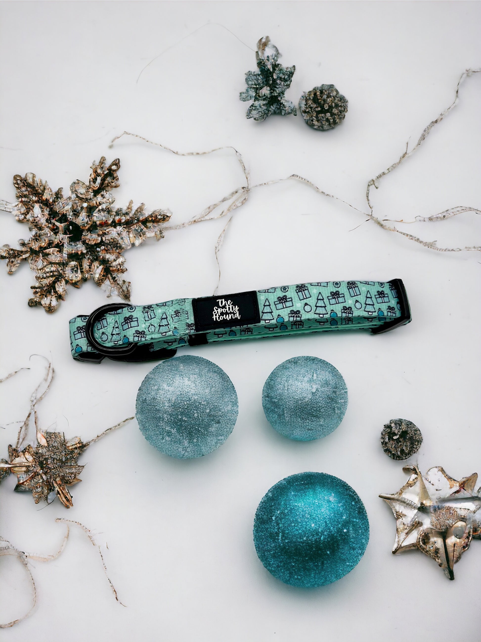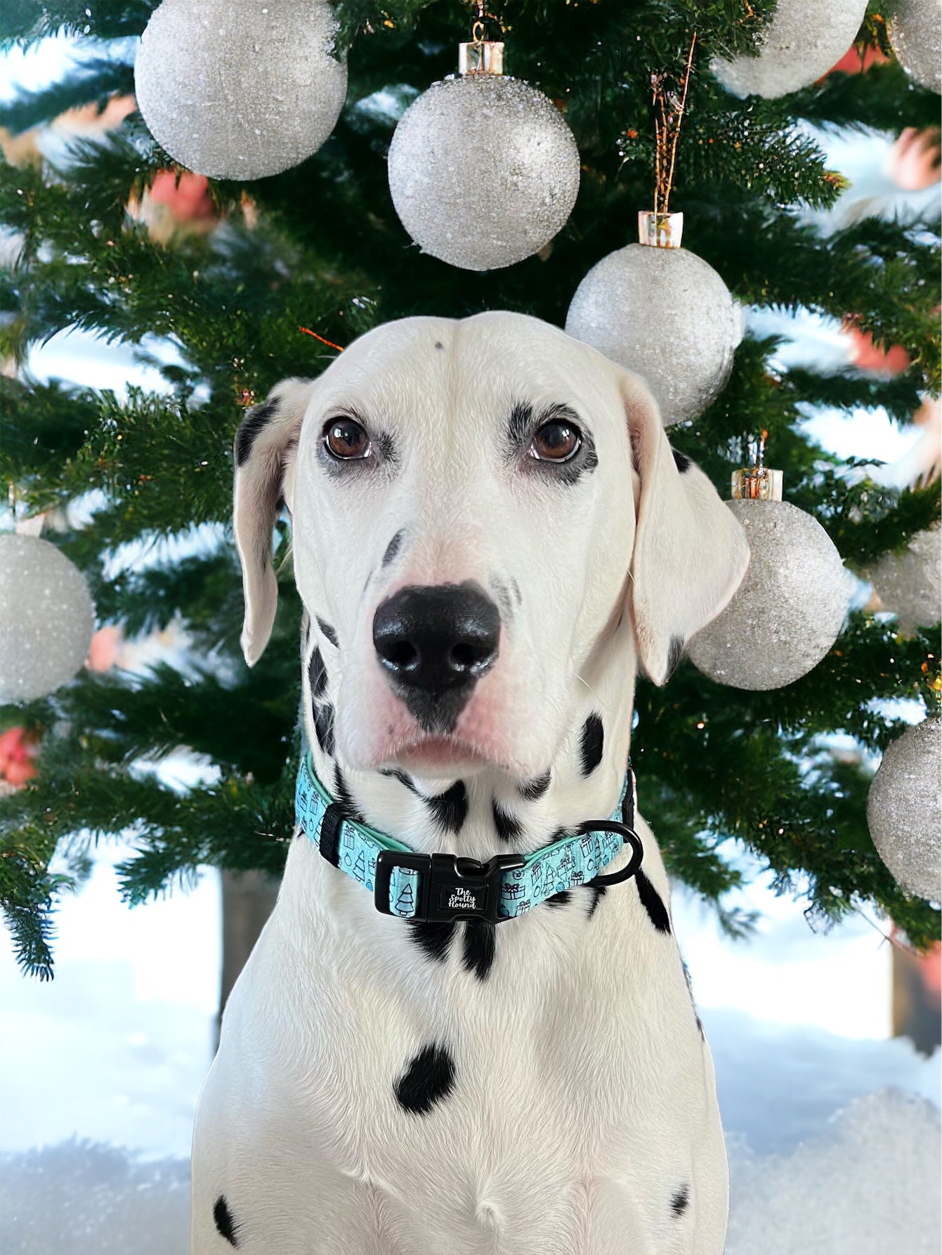 Never a truer word said! This Christmas like Audrey said ‘Don’t be like the rest of them darling’ we introduce our second Spotty Hound Christmas collection ‘Christmas at Tiffany’s’. With the signature Tiffany green base colour sprinkled with teal baubles and aquamarine Christmas trees finished off with the iconic white bow on our standard collar.